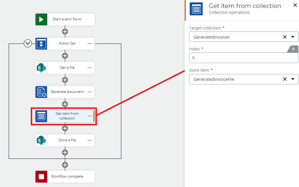 Once we have the file from the collection, you can do a multitude of actions such as send it off via email, route for approval, or even sent out to be e-signed. For this example, we are just storing it back into our SharePoint Online list using the Store a file action.