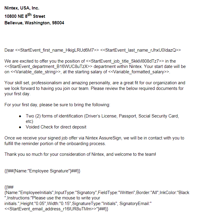 Based on the above, we see that we are creating a JotBlock for “Initials” name “EmployeeInitials”, and it will be “Written” in “Black” ink. Since the document will be generated and then sent to AssureSign, we can start to do some dynamic things with this, like passing the email address from Nintex Document Generation. Here is what the Word template looks like for our workflow: